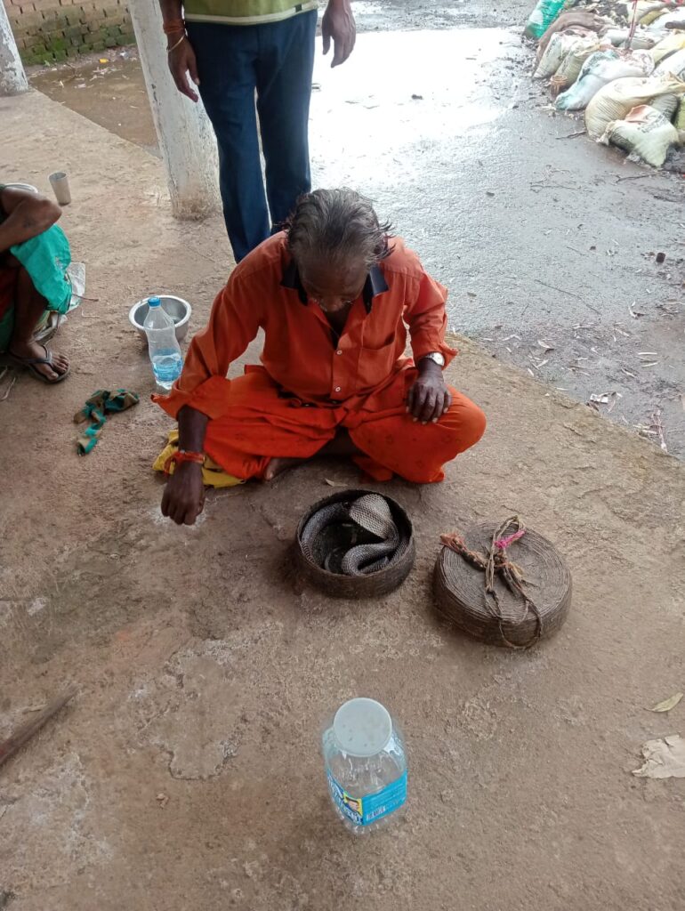 अमरकंटक। श्रवण उपाध्याय। अमरकंटक – मां नर्मदा की उद्गम स्थली / पवित्र नगरी अमरकंटक से लगभग पच्चीस किलोमीटर दूर लालपुर क्षेत्र में एक सपेरा जिंदा सांप को लेकर ग्रामीण जानों को सपेरा का खेल , प्रदर्शन दिखा रहा था । इंदिरा गांधी राष्ट्रीय जनजातीय विश्वविद्यालय अमरकंटक के सर्प विशेषज्ञ भास्कर वरमे को इसकी खबर मिली तो उन्होंने तत्कार अपने वालेंटियर सतेंद्र कुमार तथा बीट गार्ड डी डी सोनवानी को सूचित किया । सूचना पाते ही सभी मौके पर पहुंच सपेरा को रोका गया ।
