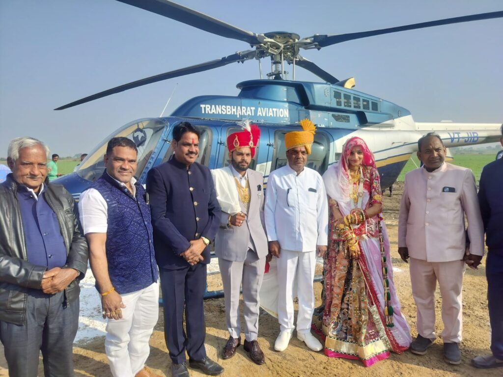 देपालपुर। संदीप सेन। उजालिया गांव में रविवार का दिन इतिहास के पन्नों में दर्ज होने जैसा रहा, जब दूल्हा कुंवर गजेंद्र सिंह तंवर अपनी शादी की बारात हेलीकॉप्टर से लेकर दुल्हन पक्ष के गांव पहुंचे। आसमान में मंडराते हेलीकॉप्टर को देखने के लिए सुबह से ही ग्रामीणों में उत्साह व रोमांच चरम पर था। ठिकाना छोटा बागरदा के रूदन सिंह के पुत्र कुंवर गजेंद्र सिंह तंवर की बारात ठिकाना उजालिया में राजन सिंह व जितेंद्र सिंह की सुपुत्री तनिष्का कुंवर के यहां पहुंची। हेलीकॉप्टर के लैंड होते ही दूल्हे का राजपूत शौर्य परंपरा के अनुरूप शाही अंदाज में स्वागत किया गया। ढोल-नगाड़ों, शस्त्र-धारण और परंपरागत पहनावे के साथ वर पक्ष का आगमन दृश्य देखने लायक रहा। हेलीकॉप्टर के आगमन के लिए गांव उजालिया में प्रशासन से अनुमति लेकर विशेष हेलिपैड तैयार किया गया था। सुरक्षा की दृष्टि से पुलिस बल भी तैनात रहा। बारातियों के स्वागत में दुल्हन पक्ष द्वारा उम्मेद-ए-राजपूताना की परंपरा का पालन करते हुए तिलक, आतिथ्य एवं राजसी व्यंजनों की व्यवस्था की गई। दूल्हा गजेंद्र सिंह तंवर को हेलीकॉप्टर से उतारते ही वरमाला स्थल तक पारंपरिक राजपूताना धुनों के साथ ले जाया गया। इस दौरान गांव के बुजुर्गों, समाजजनों और रिश्तेदारों ने दूल्हे को शुभाशीष प्रदान किया। पूरे आयोजन में शाही रस्मों की भव्यता और आधुनिकता का संगम दिखाई दिया। गांव में पहली बार हेलीकॉप्टर से बारात आने से बच्चों से लेकर बुजुर्गों तक में उत्साह देखने को मिला। ग्रामीणों ने इस अनोखे पल को अपने मोबाइल कैमरों में कैद कर यादगार बना लिया। समारोह में समाज के अनेक गणमान्यजन, रिश्तेदार एवं बड़ी संख्या में ग्रामीण उपस्थित रहे। देर रात तक पारंपरिक विवाह रस्मों के साथ आयोजन हर्षोल्लास व सौहार्दपूर्ण माहौल में चलता रहा।