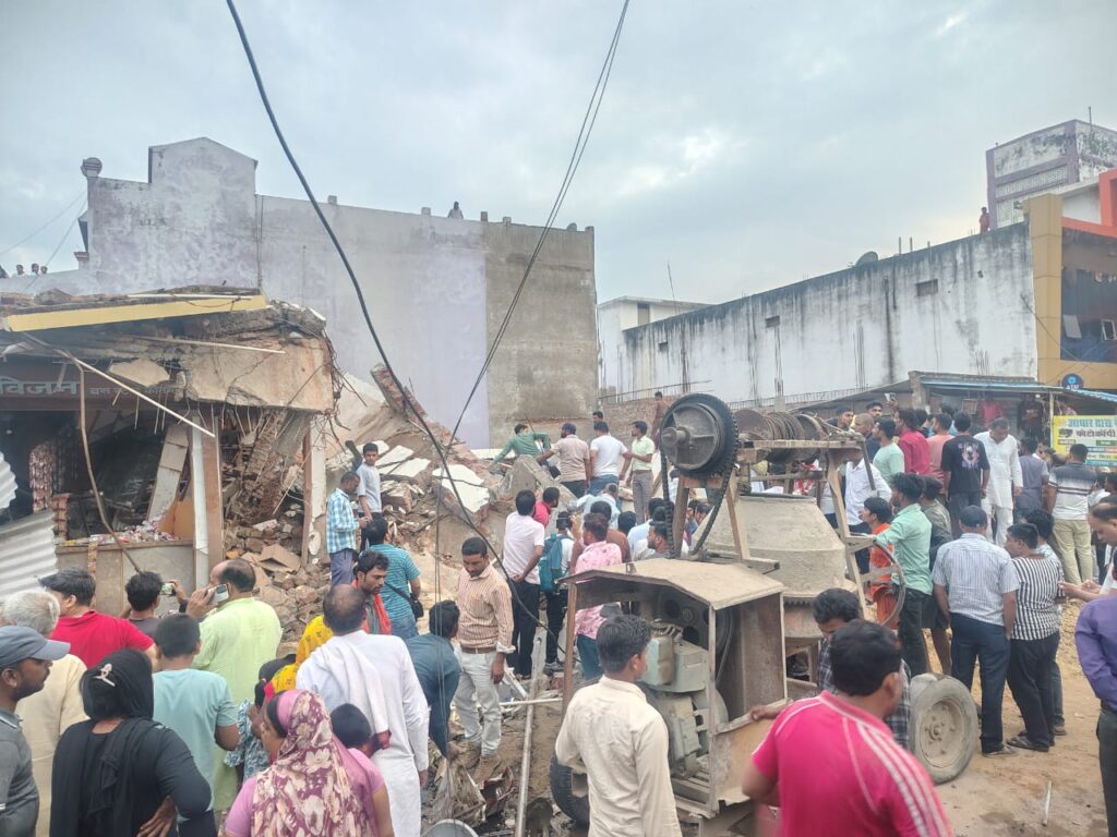 अनूपपुर। जिले के कोतमा थाना अंतर्गत कोतमा बस स्टैंड के वार्ड क्रमांक 05 में संचालित अग्रवाल लाज जो चार मंजिला थी शनिवार की शाम लगभग 5:30 बजे अचानक भरभरा कर गिर गई । जिसमें दर्जनों मजदूर की दबने की आशंका है वही अगल-बगल की दुकान भी दब गई है । कई घायलों को बाहर निकाल लिया गया है। बताया जाता है कि लाज के बगल से निर्माण कार्य चल रहा था इसी दौरान यह घटना घटी है ।