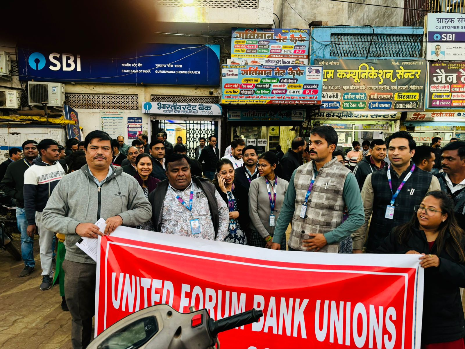 यूनाइटेड फोरम ऑफ बैंक यूनियंस (UFBU) के आह्वान पर 5 दिवसीय बैंकिंग सप्ताह की मांग को लेकर प्रदर्शन Raajdhani News